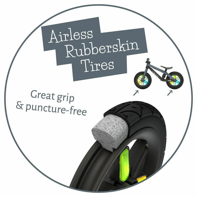 • Anvelopele RubberSkin de 12’’ nu permit intrarea aerului, așadar îți oferă aderență perfectă și nu mai trebuie să le umfli.