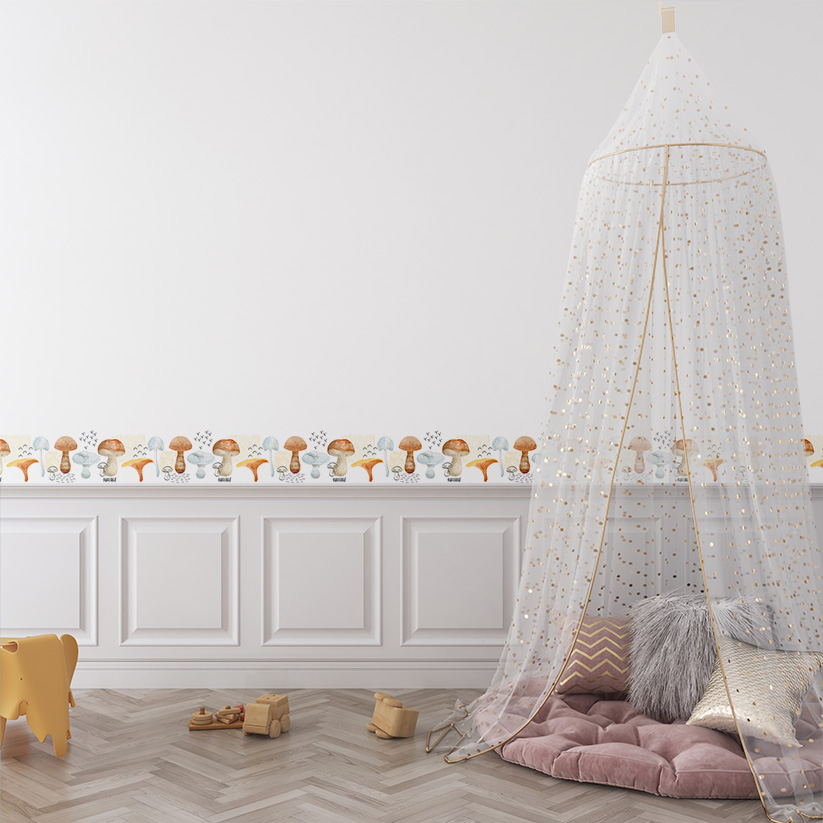 Adaugă un plus de farmec dormitorului copilului tău cu o bandă decorativă de 5 metri, ilustrată cu un imprimeu de ciuperci colorate, prezentând elemente îndrăgite din lumea Disney!