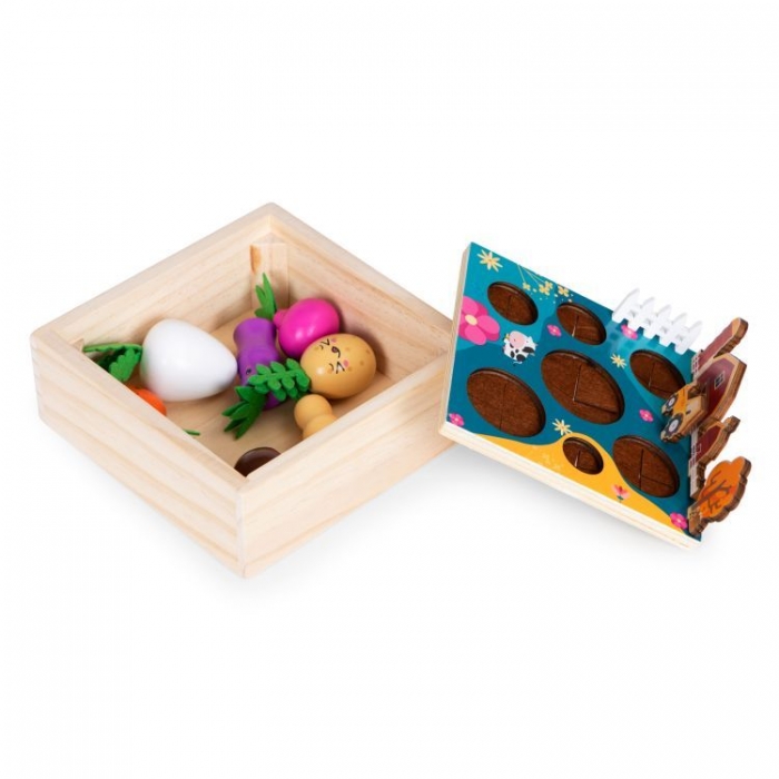 Cutia este realizată în întregime din lemn, iar construcția sa este sigură pentru copil. Setul este format dintr-o ladă și 7 legume, care sunt așezate pe capacul cutiei. Jucăria dezvoltă abilitățile manuale și vă permite să vă extindeți cunoștintele de bază despre legume. Produsul este ambalat într-o cutie de transport special consolidată, toate elementele sunt asigurate corespunzător, astfel încât să nu fie deteriorate în timpul transportului.