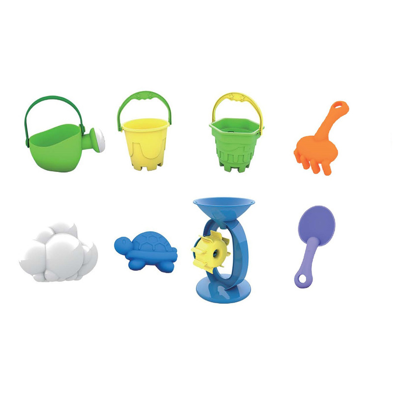- 8 jucării incluse (moară, stropitoare, lopată, greblă, norișor de apă, 2 x găleți, formă)