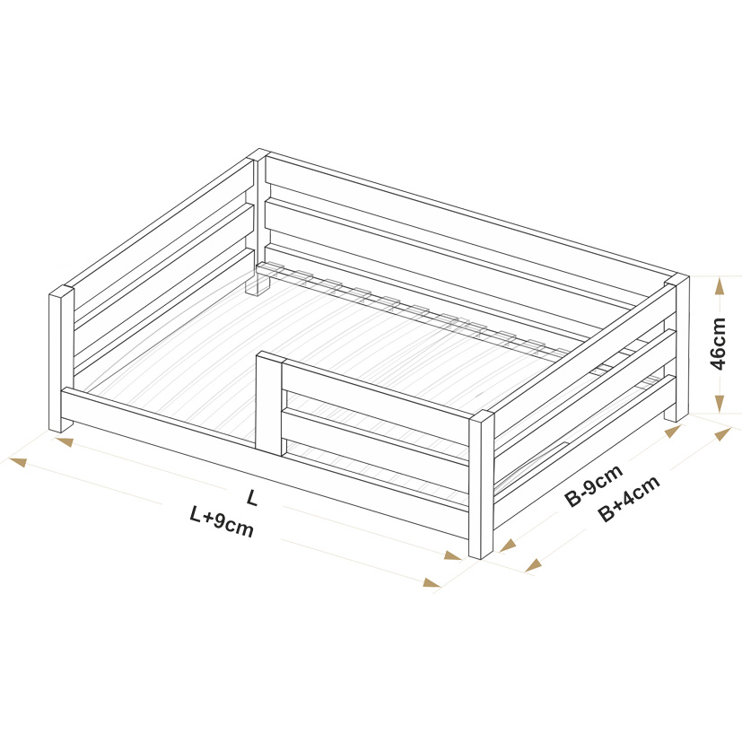 Structura patului este confecționată din lemn masiv de pin de calitate superioară, recunoscut pentru durabilitatea și rezistența sa. Suprafața lemnului este atent finisată prin șlefuire și lustruire, oferindu-i o textură fină și plăcută la atingere, asigurând o suprafață complet netedă, ideală pentru un mediu natural și sigur.