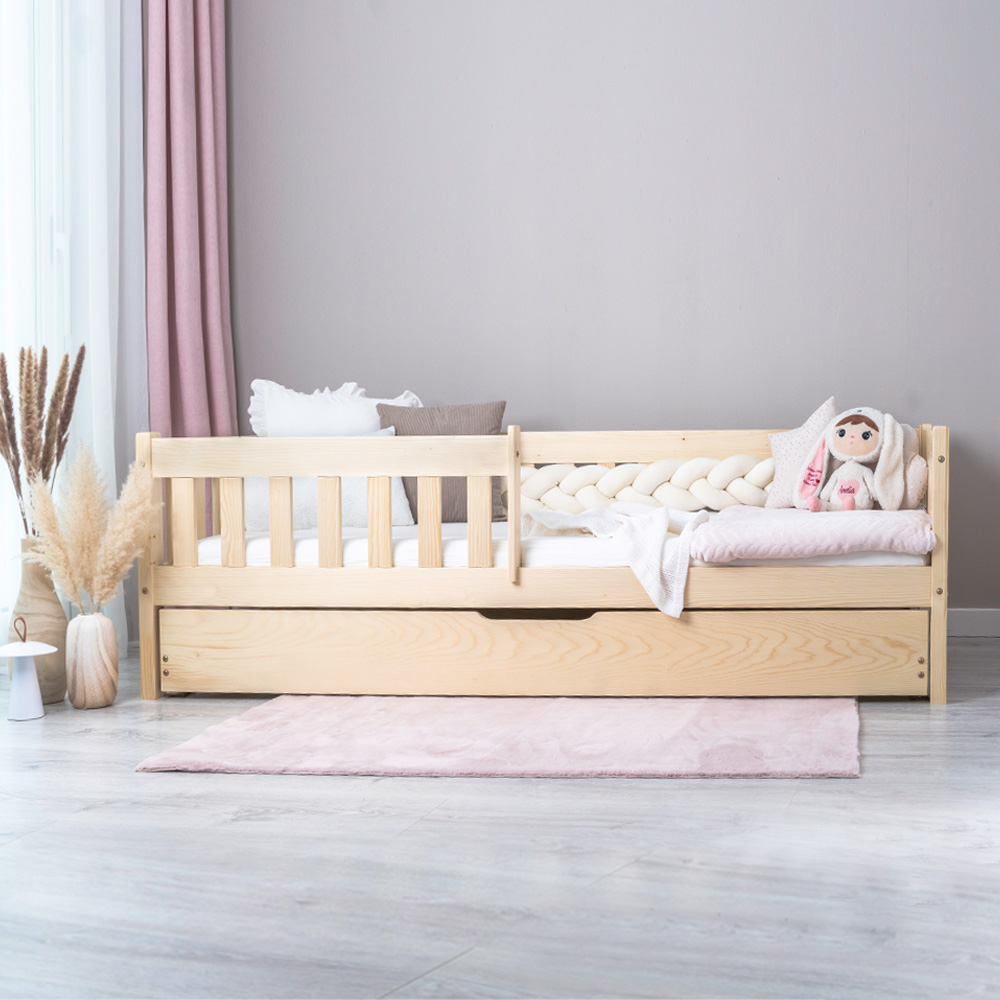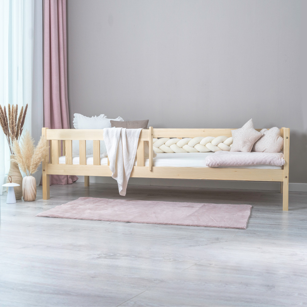 Este unul dintre cele mai bine vândute paturi clasice din gama noastră și se integrează armonios în orice cameră de copil. Fabricat din lemn de pin de înaltă calitate, având muchiile rotunjite, conferă durabilitate, stabilitate și o senzație de securitate pentru cel mic. Acest model de pat vine la pachet cu o balustradă reversibilă, putând fi montată în funcție de nevoile tale, fie pe partea stângă, fie pe partea dreapta a patului. Opțional poți alege și un serat care se va integra perfect cu patul ales.