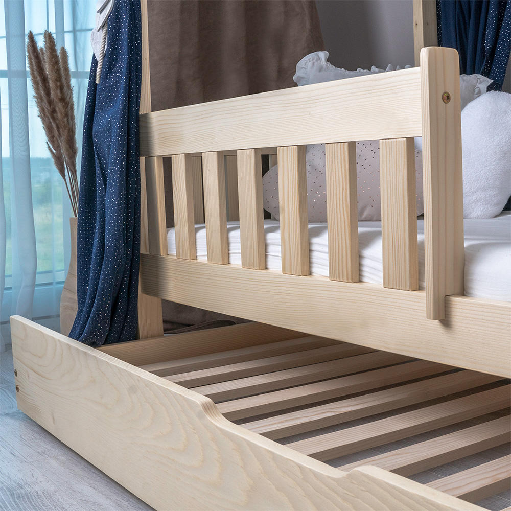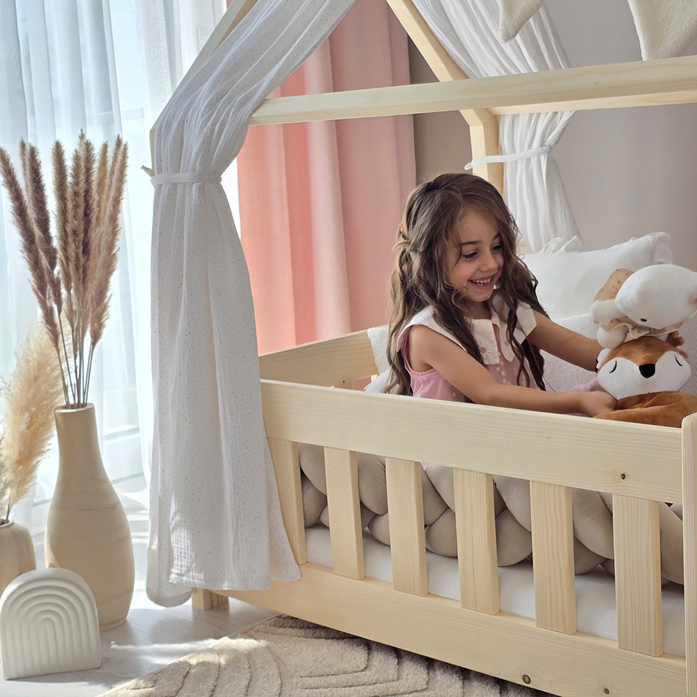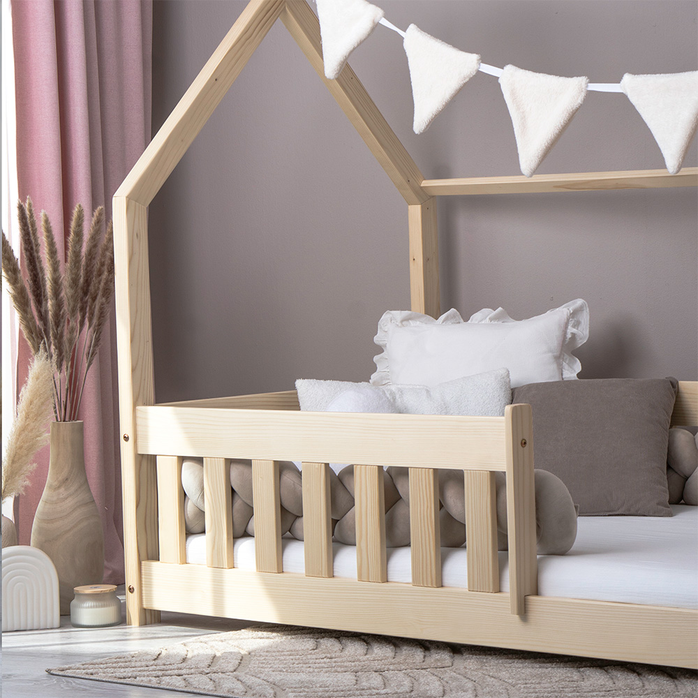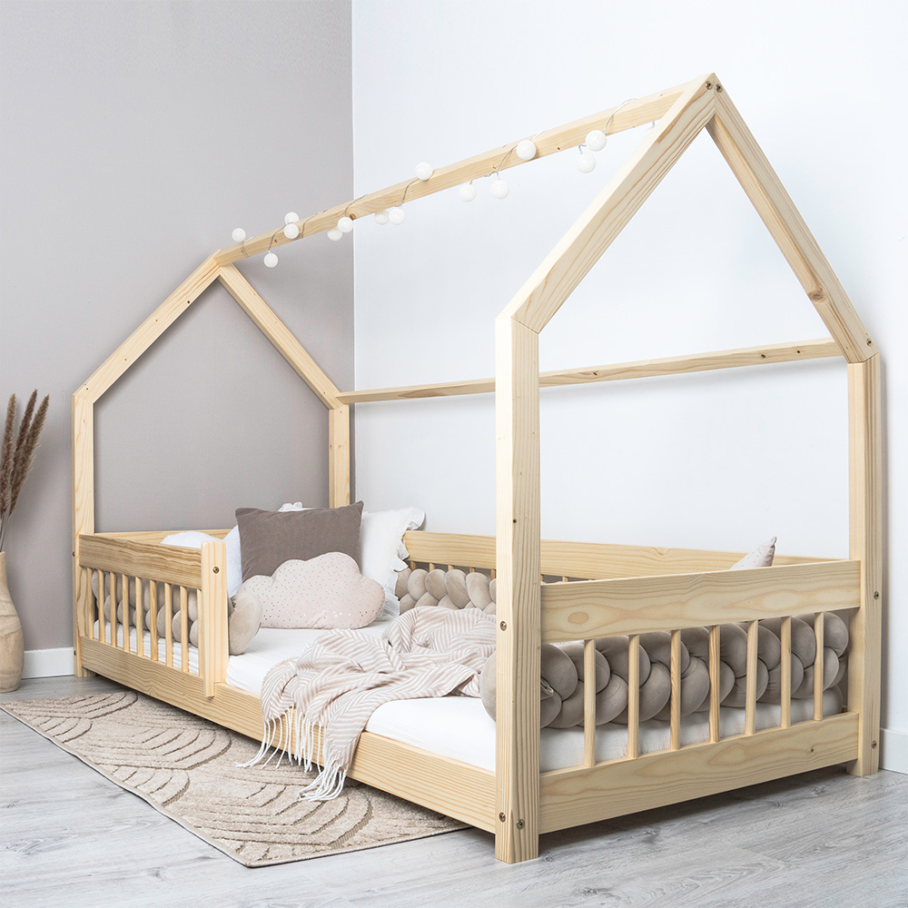 Acest pat montessori tip căsuță pentru copii va oferi copilului tău un loc sigur în care să doarmă, iar în timpul zilei, va deveni un loc de joacă și relaxare. Fabricat din lemn masiv, esență de pin de înaltă calitate, având muchiile rotunjite, acest pat are o formă de căsuță, creând o atmosferă ludică și atrăgătoare în camera copilului. Deasemenea montarea grindei frontale este optională. Este ideală pentru copii cu vârsta de peste 2 ani.