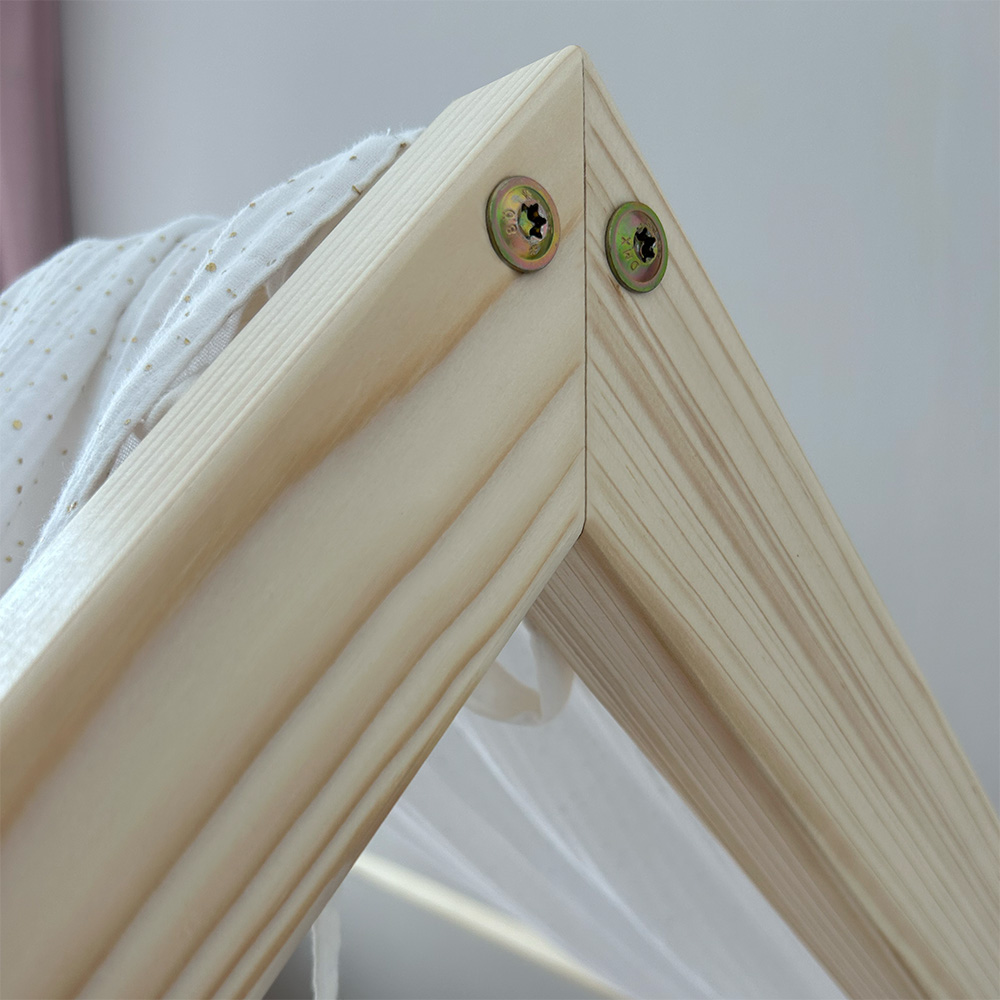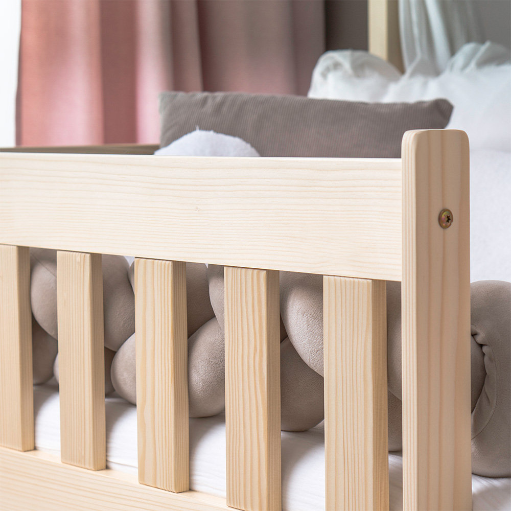 Structura patului este confecționată din lemn masiv de pin de calitate superioară, recunoscut pentru durabilitatea și rezistența sa. Suprafața lemnului este atent finisată prin șlefuire și lustruire, oferindu-i o textură fină și plăcută la atingere, asigurând o suprafață complet netedă, ideală pentru un mediu natural și sigur.