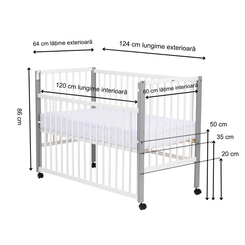 Pătuț din lemn bebe cu laterală culisantă, 120x60 cm, înălțime saltea reglabilă pe 3 nivele, cu 3 bețe detașabile, Qmini, Maya, Alb Pătuț din lemn bebe cu laterală culisantă, 120x60 cm, înălțime saltea reglabilă pe 3 nivele, cu 3 bețe detașabile, Qmini, Maya, Alb